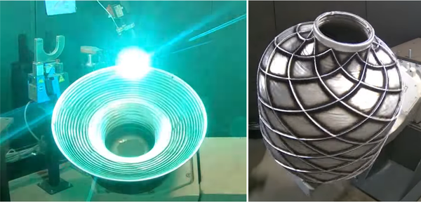 ▲ MX3D사의 Reinforced Pressure Vessel WAAM 적층제조 공정 및 완성품의 사진(출처: YouTube, MX3D-WAAM Reinforced Pressure Vessel)Al 선재를 활용한 WAAM공정에 의한 대형 구조물의 제조는 분말기반 PBF 공정의 낮은 소재 회수율과 높은 분말 가격을 동시에 극복할 수 있으며, 경제적인 아아크(Arc)열을 이용한 용해 및 단기간의 적층공정 시간 등을 장점으로 경제성을 확보할 수 있어, 기존의 압연판재 제조 및 용접 공정을 대체할 수 있을 것으로 기대된다.