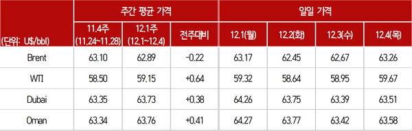 한국석유공사 석유정보센터(PISC)가 발표한 ’12월 1주 주간 국제유가 동향‘에 따르면, 대서양 유종인 브렌트유는 전주대비 배럴당 0.22달러 하락한 62.89달러를 기록했다. 반면 미국 서부텍사스산원유(WTI)는 0.64달러 올라 59.15달러로 집계됐다.