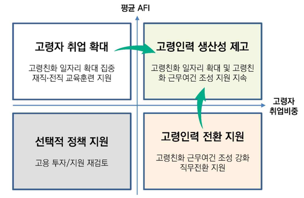 이를 위해 “고령인력활용을 개선하기 위한 정책적 방향으로 고령친화 일자리를 확대하고, 고령친화 근무여건을 조성하며, 고령인력의 생산성을 제고해야 한다”며, “구체적으로 단순노무직 중심에서 경험과 지식을 활용할 수 있는 서비스업 중심으로 전환하고, 취업지원 강화, 재직·전직 교육훈련 확대, 에이지테크 활용을 촉진해야 한다”고 말했다.