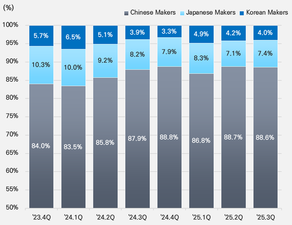 국적별 점유율 측면에서는 중국 기업들이 전체 시장의 약 90%에 육박하는 점유율을 기록하며 독주 체제를 이어가고 있다. ’23년 3분기 이후 일본과 한국 기업의 점유율은 지속적으로 감소하는 추세이며, ’25년 3분기에는 일본 7.4%, 한국 4%로 집계됐다.