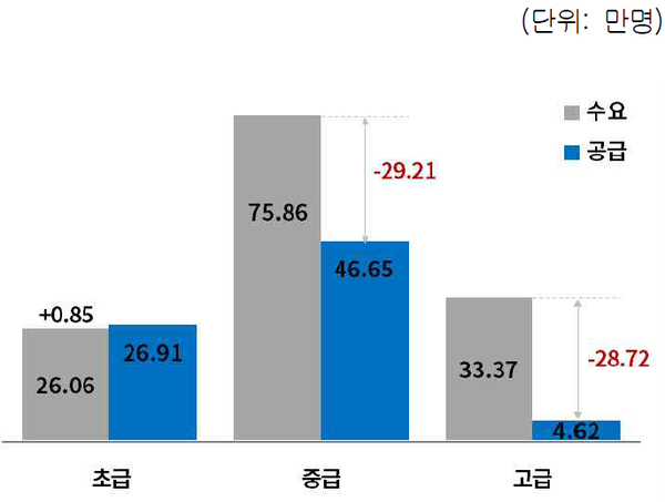 보고서는 “2029년까지 AI·클라우드·빅데이터 등 신기술 분야의 중급인재가 29만 2천여명이 부족하고, 고급인재는 28만 7천여명 가량이 부족하다”며, “이는 AI 기반 기업의 성장동력을 약화시킬 수밖에 없다”고 지적했다.