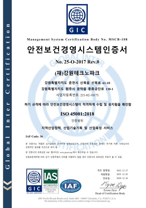 이번 인증은 Global Inter Certification(GIC)의 정기 심사를 통해 적합 판정을 받은 것으로, ’25년 12월 3일자로 재발행돼 ’28년 12월 26일까지 유효하다. 인증 범위는 지역산업정책, 산업기술기획, 산업육성 서비스이며 △춘천 △원주 △홍천 △강릉 △삼척 △태백 등 주요 사업장이 포함됐다.