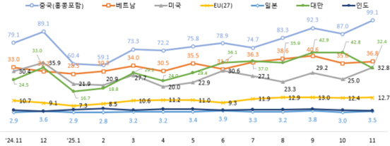 지역별 수출 동향을 보면, 인도(-8.9%)는 감소한 반면 △중국(홍콩 포함, 25.3%↑) △베트남(11.6%↑) △유럽연합(18.1%↑) △미국(7.9%↑) △대만(32.2%↑)은 증가세를 이어 갔다. 또한 일본(18%↑)은 반도체와 컴퓨터·주변기기 수출 증가로 전체 수출이 증가세로 전환됐다.