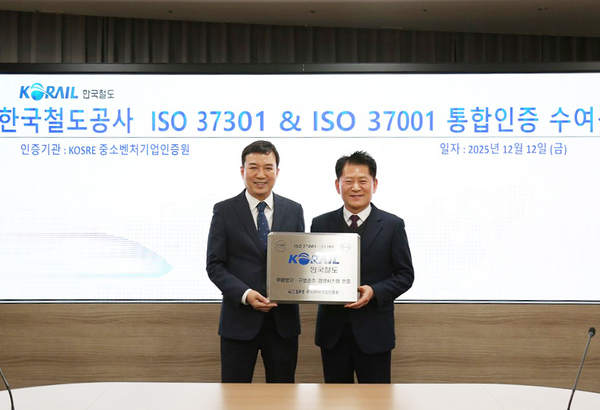 코레일은 국제표준화기구(ISO) 공인 인증기관인 중소벤처기업인증원으로부터 규범준수 경영시스템(ISO 37301)과 부패방지 경영시스템(ISO 37001) 통합인증을 획득했다고 15일 밝혔다.