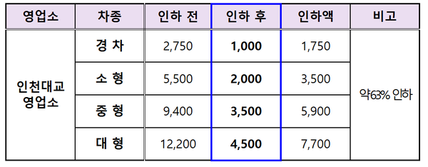 이에 따라 경차는 기존 2,750원에서 1,000원으로, 소형(승용차)은 5,500원에서 2,000원으로 중형(버스·10톤 미만 화물차)은 9,400원에서 3,500원으로, 대형(10톤 이상 트럭)은 12,200원에서 4,500원으로 통행료가 인하된다.