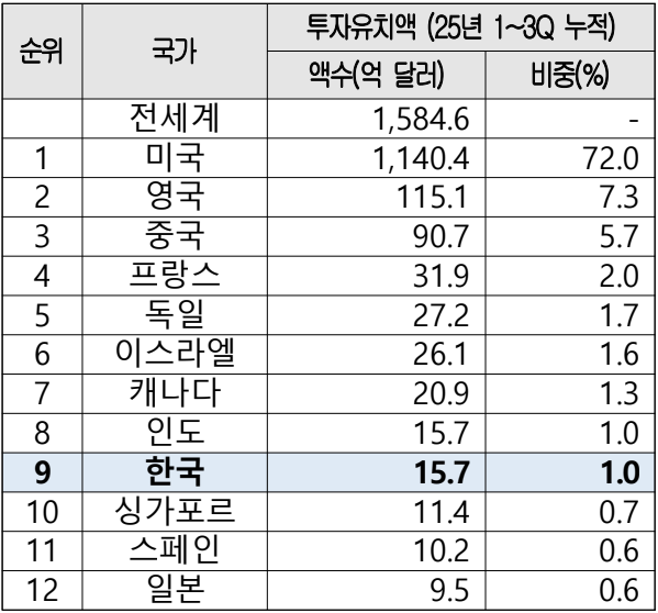 ’25년 기준 AI분야 벤처투자 유치 2위 국가는 영국으로 115억달러를 기록했고, 3위는 90억달러인 중국이 차지했다. 우리나라는 15.7억달러로 9위를 기록했으며, 규모면에선 미국의 1/73, 영국의 1/7, 중국의 1/6 수준이었다.