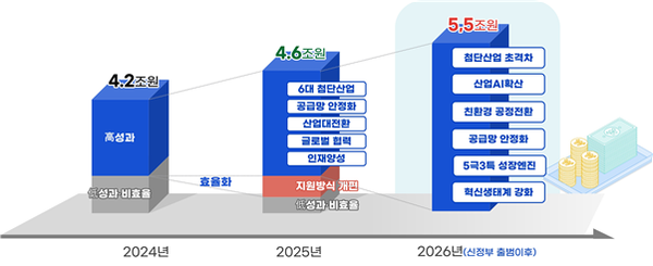 먼저 산업부는 ’25년대비 18% 증액된 역대 최대규모인 총 5.5조원을 지원하며, 신규 지원과제는 `25년대비 85% 증가한 1.4조원을 투자한다.