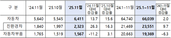 ▲ 2025년 11월 친환경차 내수·수출 동향(단위: 대, %)(출처: 산업통상부)