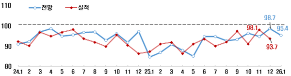 업종별로는 제조업(91.8)과 비제조업(98.9) 모두 부진할 것으로 전망됐다. 제조업 BSI(91.8)는 ’24년 4월부터 1년 10개월 연속 기준치를 하회했다. ’25년 12월(105.2) 기준선 100을 넘어섰던 비제조업 BSI는 ’26년 1월 98.9로 전망되면서 한 달 만에 기준선 아래로 내려왔다.