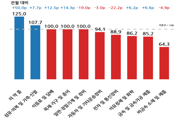 제조업 세부 업종(총 10개) 중에서는 의약품(125)과 섬유·의복 및 가죽·신발(107.7)이 호조 전망을 보였다. 기준선(100)에 걸친 3개 업종(일반·정밀기계 및 장비, 목재·가구 및 종이, 식음료 및 담배)을 제외한 비금속 소재 및 제품(64.3) 등 나머지 5개 업종은 업황 부진이 전망된다.