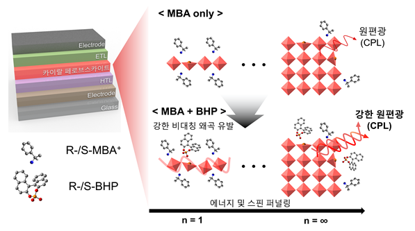 기존에는 키랄 분자 한 종만 첨가하는 방식이 주를 이뤘으나, 구조의 비틀림이 균일하지 않아 편광 방향의 순도나 밝기가 급격히 떨어졌다. 연구팀은 역할을 분담하는 ‘메틸벤질 암모늄(MBAI)’과 ‘비나프틸 인산염(BHP)’ 두 가지 키랄 분자를 혼합하는 방식으로 이를 해결했다.