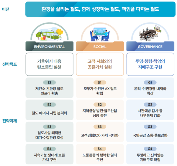 ▲ 한국철도공사의 신규 ESG 비전(출처: 한국철도공사)한국철도공사(코레일)가 ESG 경영을 강화해 철도산업의 ESG를 선도하고 국정과제 실현을 적극 지원해나간다.