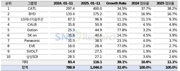 중국계 배터리사의 성장세는 더욱 뚜렷했다. CATL은 400.0GWh로 34.5% 성장하며 글로벌 1위를 공고히 했고, BYD는 175.2GWh로 31.3% 성장해 2위를 기록했다. BYD는 배터리와 전기차를 동시에 생산하는 구조를 기반으로 가격 경쟁력을 앞세워 중국은 물론 유럽 등 해외 시장에서도 빠르게 점유율을 확대했다.