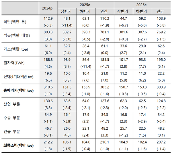 에너지경제연구원이 22일 발표한 ‘단기 에너지수요전망(2025~2026)’에 따르면 올해 총 에너지 수요는 전년대비 0.4% 감소하여 303.9백만toe를 기록할 전망이다.