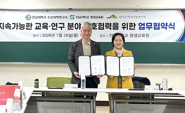 산림청 산하 한국수목원정원관리원(이사장 심상택)은 전남대 여수캠퍼스 평생교육원에서 한동길 국립정원문화원장, 곽인실 전남대 수산과학연구소·여수캠퍼스 평생교육원장 등이 참석한 가운데 전남대 수산과학연구소·여수캠퍼스 평생교육원과 업무협약을 체결했다고 27일 밝혔다.