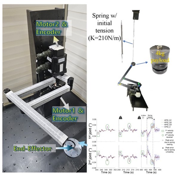 ▲ UNIS가‘적응형 PID 제어 알고리즘’을 개발해 성능 검증을 위해 2관절 로봇을 제작(左)하고 실험을 수행한 결과, 기존 제어 방식과 비교한 그래프를 도출했다.(右 하단)국내 연구진이 급격한 부하 변화나 외부 충격에도 로봇팔이 스스로 제어 값을 조절해 안정적으로 움직이도록 하는 ‘적응형 PID 제어 알고리즘’을 개발, 스마트 팩토리와 재활·휴머노이드 로봇 등 다양한 분야에서 로봇 활용성과 안전성을 크게 높일 것으로 기대된다.