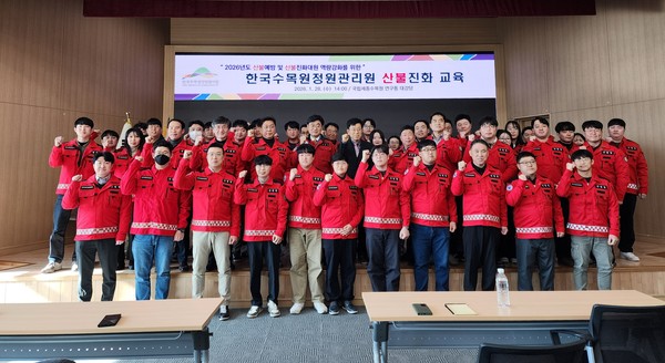 ▲ 한국수목원정원관리원 산불진화팀 구성원 대상 산불진화교육 후 기념사진을 촬영하고 있다.산림청 산하 한국수목원정원관리원(이사장 심상택)은 28일 임직원으로 구성된 산불진화반 100여 명을 대상으로 ‘산불진화 교육’을 실시했다고 밝혔다.