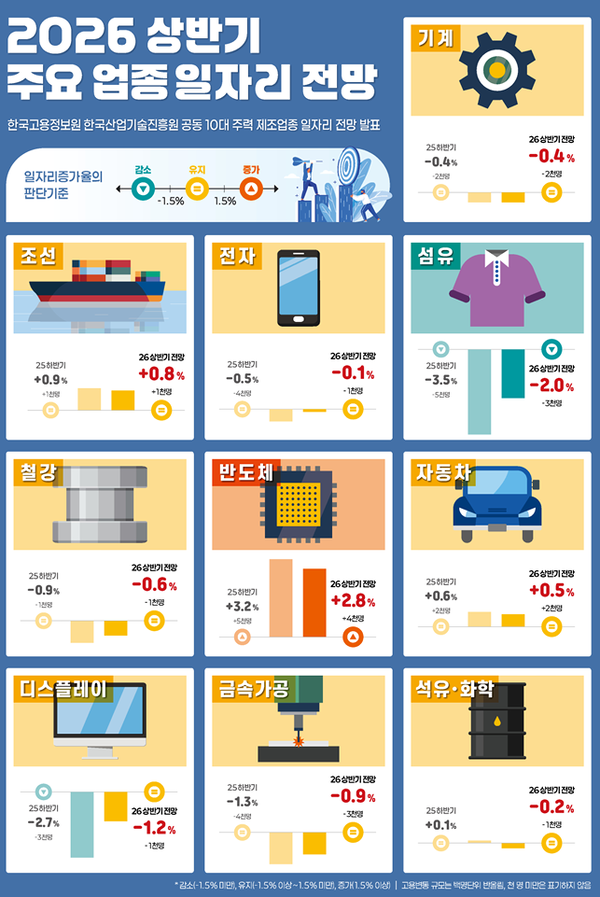 한국고용정보원(원장 이창수)과 한국산업기술진흥원(원장 민병주)이 6일 발표한 ‘2026년 상반기 주요 업종의 일자리 전망’에 따르면 지난해 상반기 대비 반도체 업종 일자리는 증가하며 섬유 업종 일자리는 감소할 것으로 예상됐다.