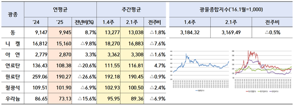 한국광해광업공단(KOMIR)이 발표한 ‘2월 1주차 주요 광물가격 동향’에 따르면, 광물종합지수는 3,169.49로 전주대비 0.5% 하락했다.