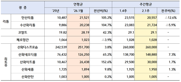 수산화리튬 역시 유사한 흐름을 나타냈다. 리튬이온 배터리 업체들이 연초 수출 물량을 앞당겨 생산하면서 삼원계 양극재(CAM) 수요가 개선됐고, 이는 가격 상승 요인으로 작용했다. 그러나 탄산리튬 약세 전환과 함께 상승 피로가 누적되면서 수산화리튬 가격도 동반 하락 압력을 받았다.