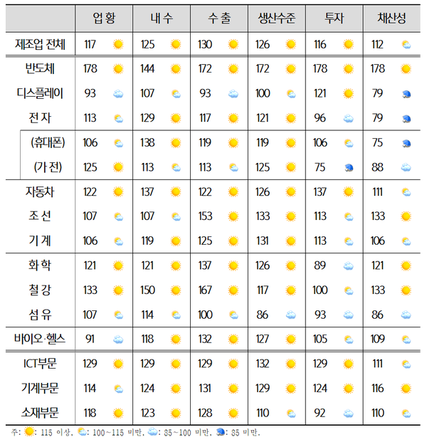 반면 디스플레이는 93으로 기준치를 하회했다. 수요 감소 심화 우려가 지속되며 업황 개선 기대는 제한적이다. 조선(107)역시 운임 약세가 부담 요인으로 작용하며 부정 평가가 우세했다.