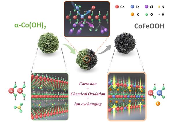 연구팀은 코발트(Co)·철(Fe) 기반 옥시수산화물(CoFeOOH)을 층상 구조로 정밀 설계하고, 촉매 표면의 전자 구조와 반응 경로를 동시에 제어하는 전략을 도입했다. 철 도입을 통해 코발트 중심의 전자 상태를 조절하고, 산소 발생 반응의 핵심 단계인 반응 중간체 흡착·탈착 과정의 에너지 장벽을 낮췄다.
