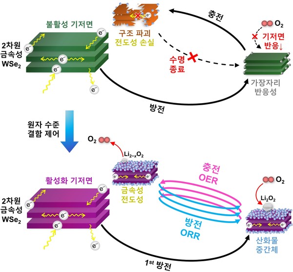 ▲ 원자 수준 결함 제어(백금 치환과 셀레늄 원자 구멍)가 도입되면 2차원 금속성 WSe2 소재 기저면이 활성화된다. 이후 첫 방전 과정에서 형성된 산화물 중간체의 높은 촉매 반응성과 금속성 소재 특유의 높은 전기전도성이 시너지를 일으켜 효율적이며 안정적으로 충·방전 사이클을 유지한다.