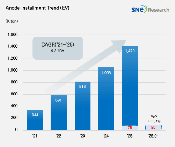 SNE리서치에 따르면, 2026년 1월 전 세계 전기차(EV·PHEV·HEV)에 사용된 배터리 음극재 총 적재량은 85,000톤으로 집계됐다고 밝혔다.