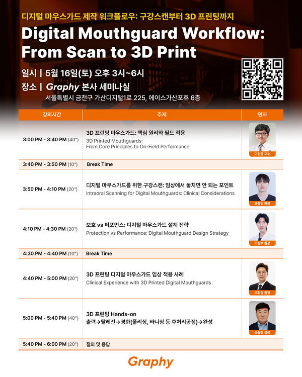 그래피는 이러한 디지털 솔루션의 확산과 현장 도입 장벽을 낮추기 위해 오는 5월16일 오후 3시, 서울 금천구 본사 세미나실에서 ‘디지털 마우스가드 워크플로우: Scan부터 3D Printing까지’를 주제로 무료 실무 세미나를 개최한다.