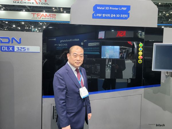▲ 이근 엘다스 대표이사가 ‘SIMTOS 2026’ DN솔루션즈 부스 내에 구축된 적층제조 장비 ‘DLX 325D’ 앞에서 기념촬영하고 있다.