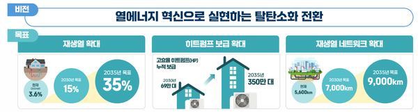 이에 정부는 ‘열에너지 혁신을 통한 탈탄소 전환’을 비전으로 재생열 확대와 히트펌프 보급, 재생열 네트워크 확충 등을 핵심 축으로 제시했다. 재생열 비중은 현재 3.6%에서 2030년 15%, 2035년 35%까지 확대하고, 고효율 히트펌프는 2030년 69만대, 2035년 350만대까지 보급을 늘릴 계획이다. 재생열 네트워크도 약 5,600km에서 2030년 7,000km, 2035년 9,000km까지 확충한다.